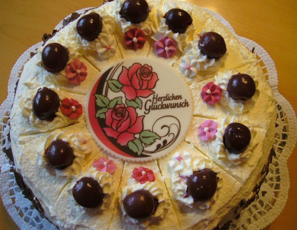 Je nach Anlass wird die Schwarzwälder Kirschtorte noch mit Schokoladeflocken, Zuckerblumen oder Glückwunschplatte verziert.