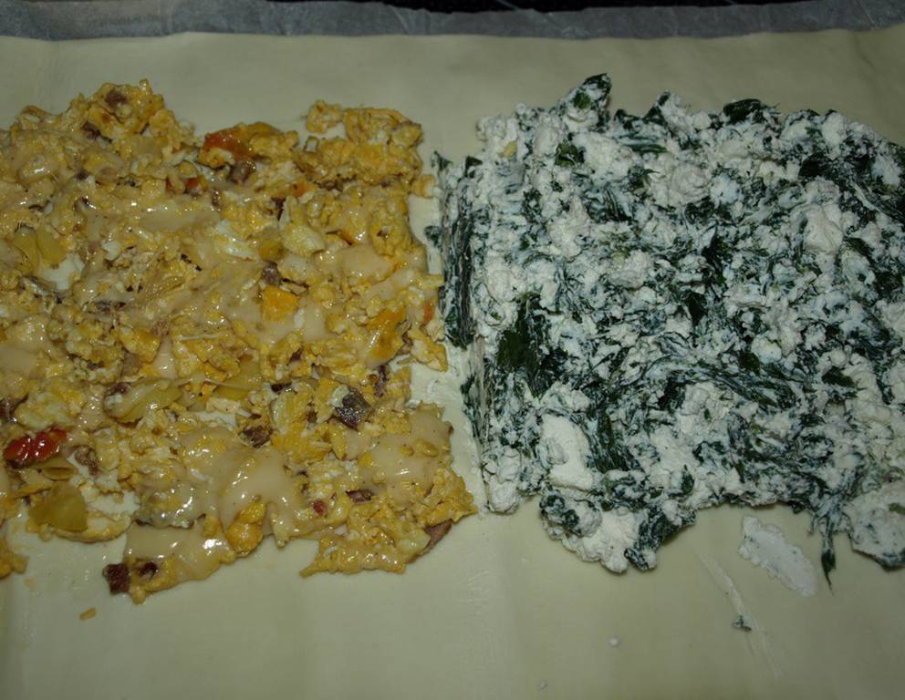 - Den Strudelteig ausrollen und die Hälfte mit der Fülle 1 belegen. Für die Fülle 2, den Speck anrösten und die verquirlten Eier dazugeben bis die Masse stockt.
