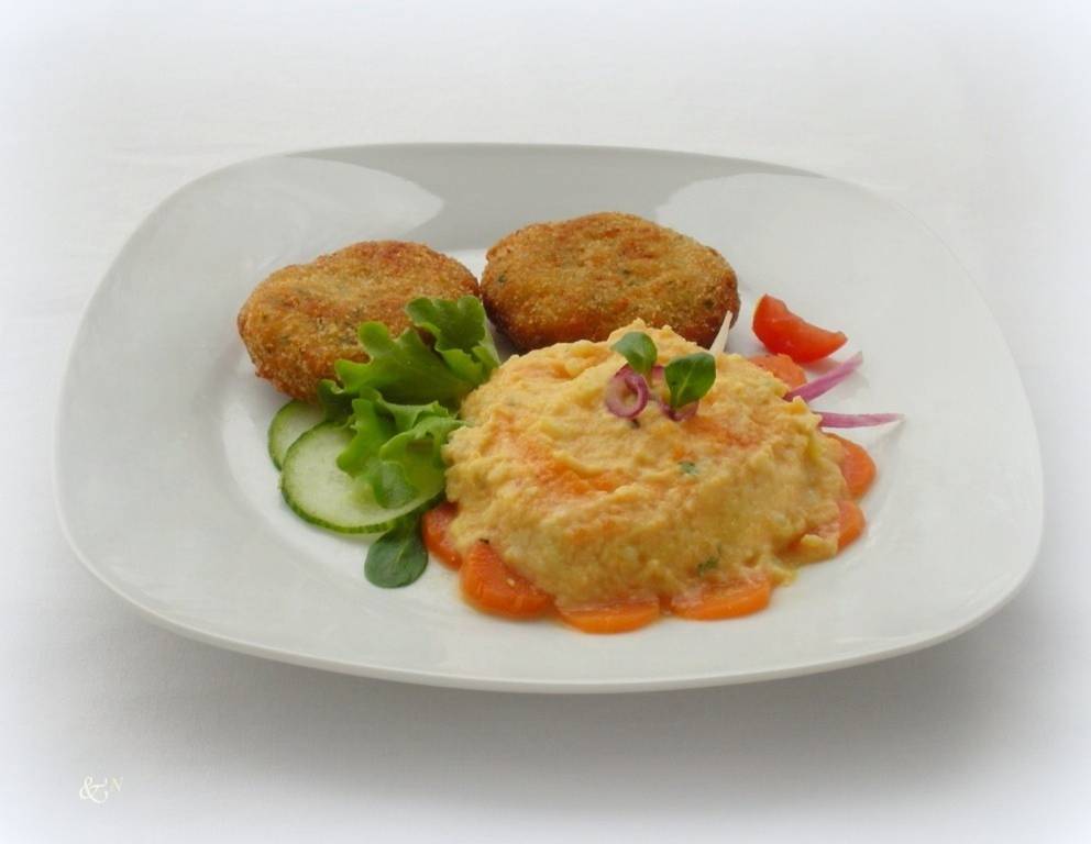 Karotten-Kartoffelpüree ist eine feine Beilage zu allen Fleisch- und Geflügelbraten, Bratwürsten, faschierte Laibchen. Etc. mit Röstzwiebel bestreut schmeckt es herrlich.