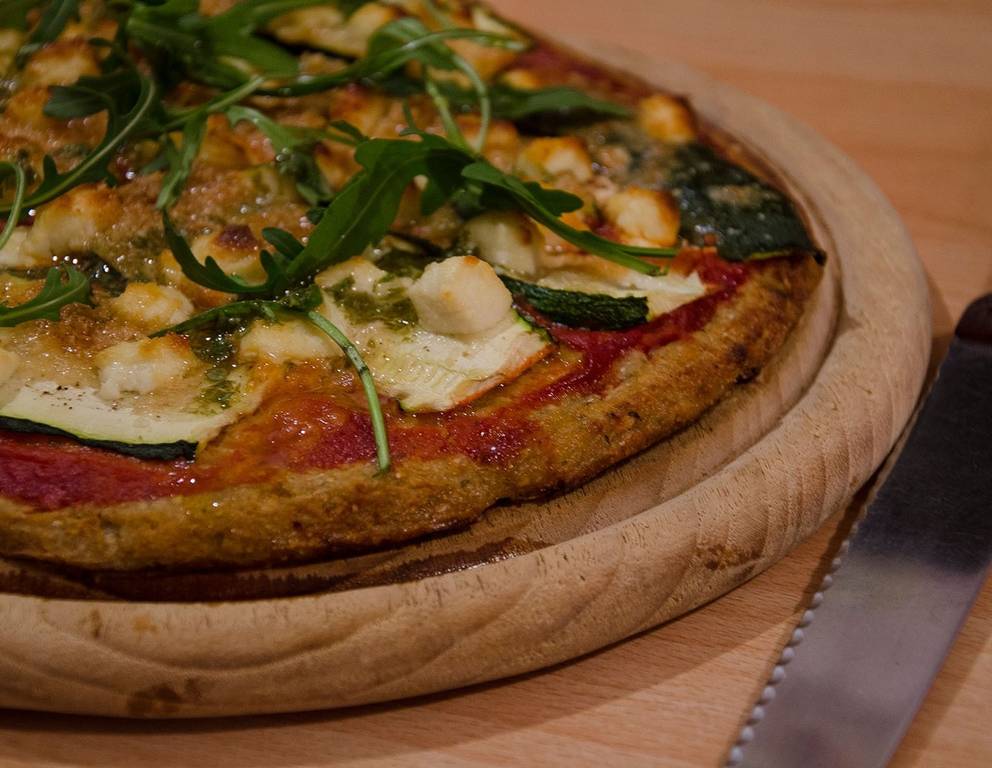 Knoblauchliebhaber können die Zucchini-Ziegenkäse Pizza auch noch mit frisch gepresstem Knoblauch bestreuen.