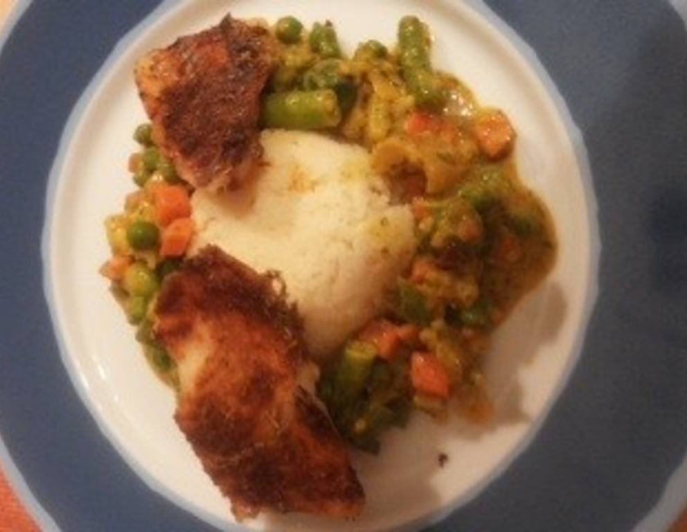 Zu Couscous mit Kokos-Currygemüse passt gebratener Fisch sehr gut!