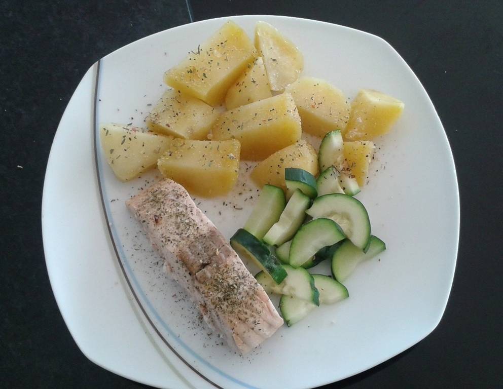 - Für den Lachs mit Kartoffel-Zuchini Gemüse die Kartoffeln schälen und würfelig schneiden. Lachs und Kartoffeln in gelochtes Dampfgarer Geschirr geben und für 10 bei 100 °C garen.