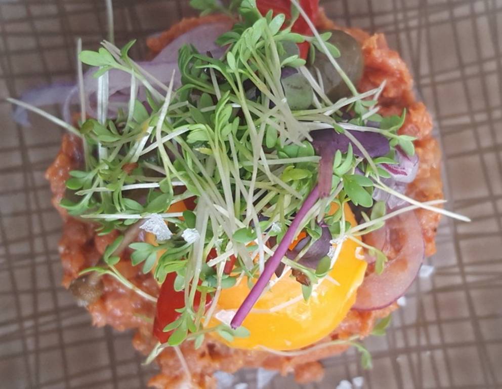 - Für das Beef Tartar das Fleisch faschieren oder ganz klein schneiden, mit feingeschnittenem Zwiebel und Senf vermengen. Nach belieben würzen.
