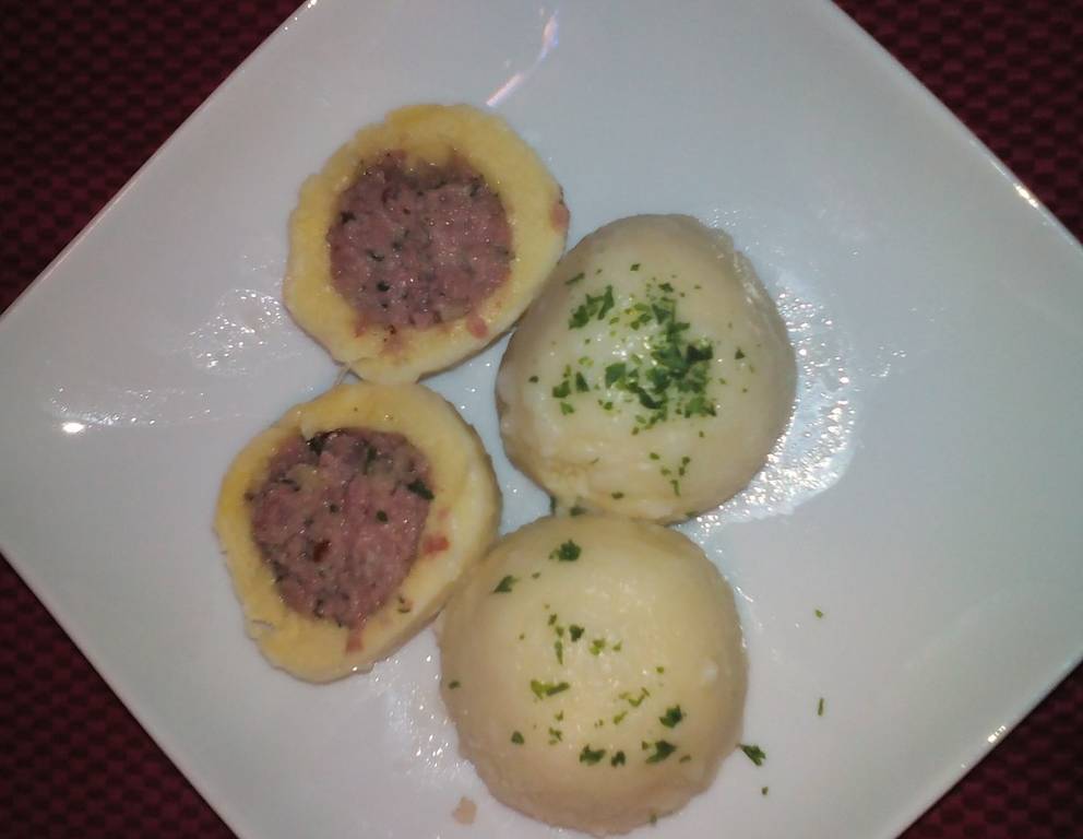- Vom Teig einen faustgroßen Teil aufnehmen, platt drücken und ein wenig auseinander ziehen. In die Mitte eine walnussgroße Menge der Fülle setzen und den Knödelteig rundherum verschließen und fest drücken. In einem großen Topf Wasser zum Kochen bringen, die Knödel zugeben und ca. 20-30min köcheln lassen. Die Knödel sind fertig, wenn sie an der Wasseroberfläche schwimmen.