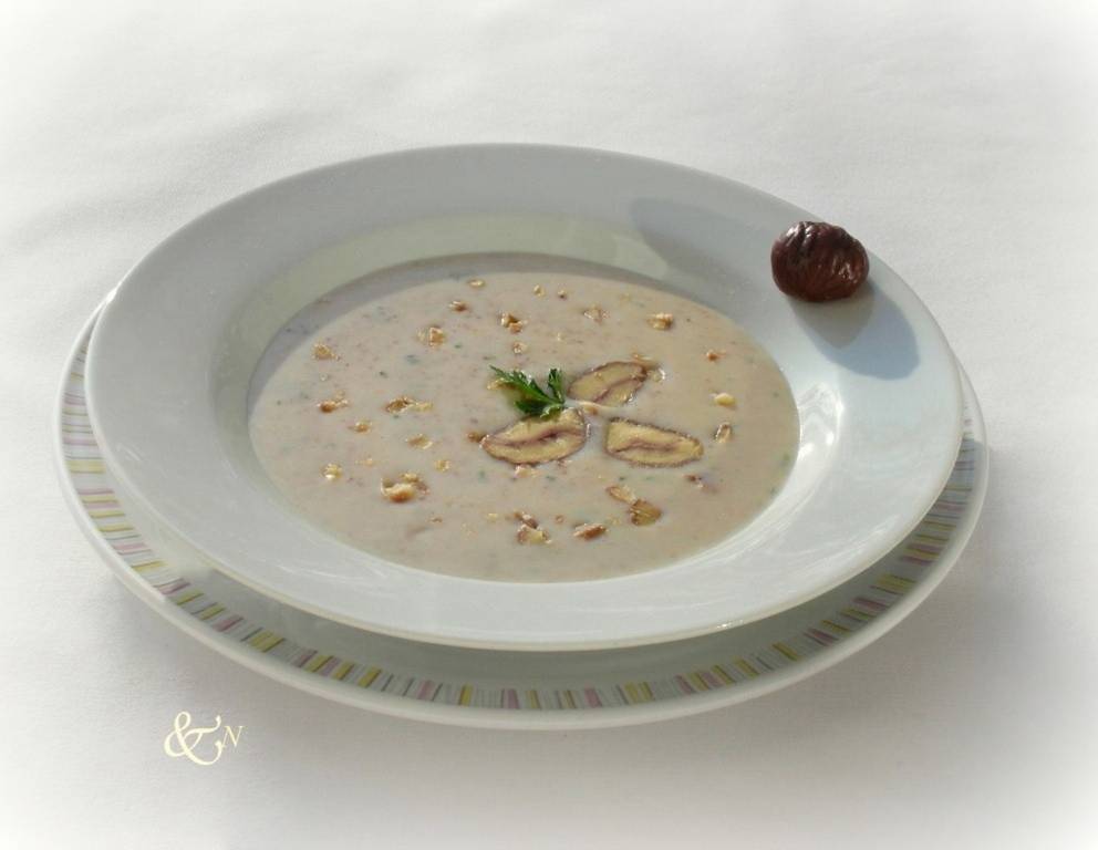 - Für die Selleriesuppe mit Maroni den Sellerie schälen und würfeln, die Schalotte fein hacken und mit dem Sellerie in der erhitzten Butter farblos anschwitzen, Maroni ebenfalls in den Topf und kurz anschwitzen.