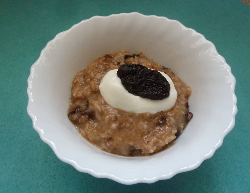 Statt Trockenzwetschken kann man auch getrocknete Marillen oder anderes Trockenobst, sowie Nüsse, etc. in den Porridge geben.