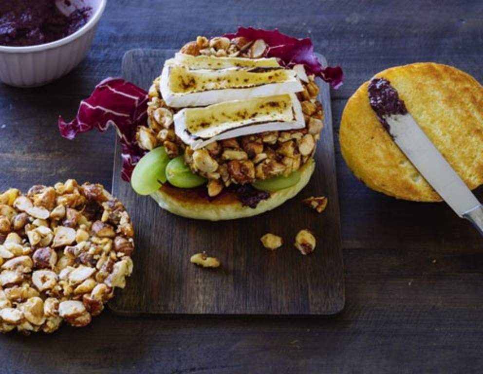 - Die Brötchen halbieren und rösten. Brötchenhälften dünn mit Olivenpaste bestreichen, den Radicchio auf die untere Hälfte geben. Die Weintrauben darauflegen und Nusspatty darüberschichten. Zuletzt Camembert darauflegen. Den Käse mit einem Küchengasbrenner nach Belieben leicht bräunen und schmelzen lassen. Dann den Crunchy Nut Burger mit der oberen Brötchenhälfte schließen.
