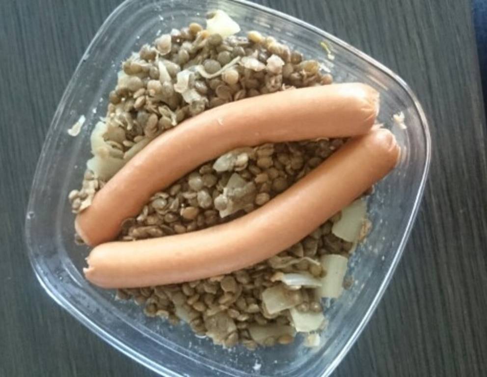 Das Linsengemüse schmeckt ideal mit Würstchen. Von dem Bohnenkraut nicht zu viel nehmen, aber dennoch ist es sehr essentiell!