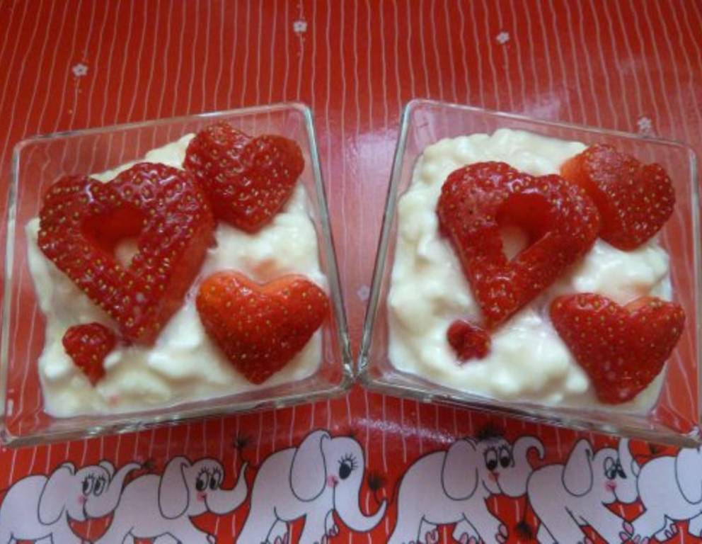 - Die Erdbeeren in die Hälfte schneiden und Herzen für die Dekoration ausstechen, die Reste kleinschneiden und unter das Dessert mischen.