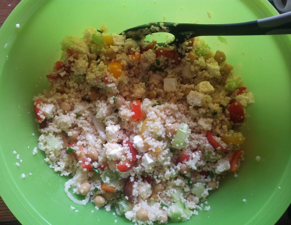 - Die Kichererbsen abseihen, mit den anderen Zutaten vermengen und den abgekühlten Couscous unterheben. Mit Salz, Pfeffer, Essig und Olivenöl abschmecken.