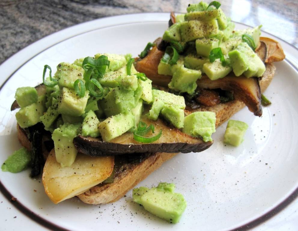 - Jungzwiebel auf den getoasteten Toastscheiben verteilen, Kräuterseitlinge darauf legen und die Avocadowürfel verteilen. Noch etwas salzen und pfeffern und als leichtes Abendessen oder Zwischenmahlzeit servieren.