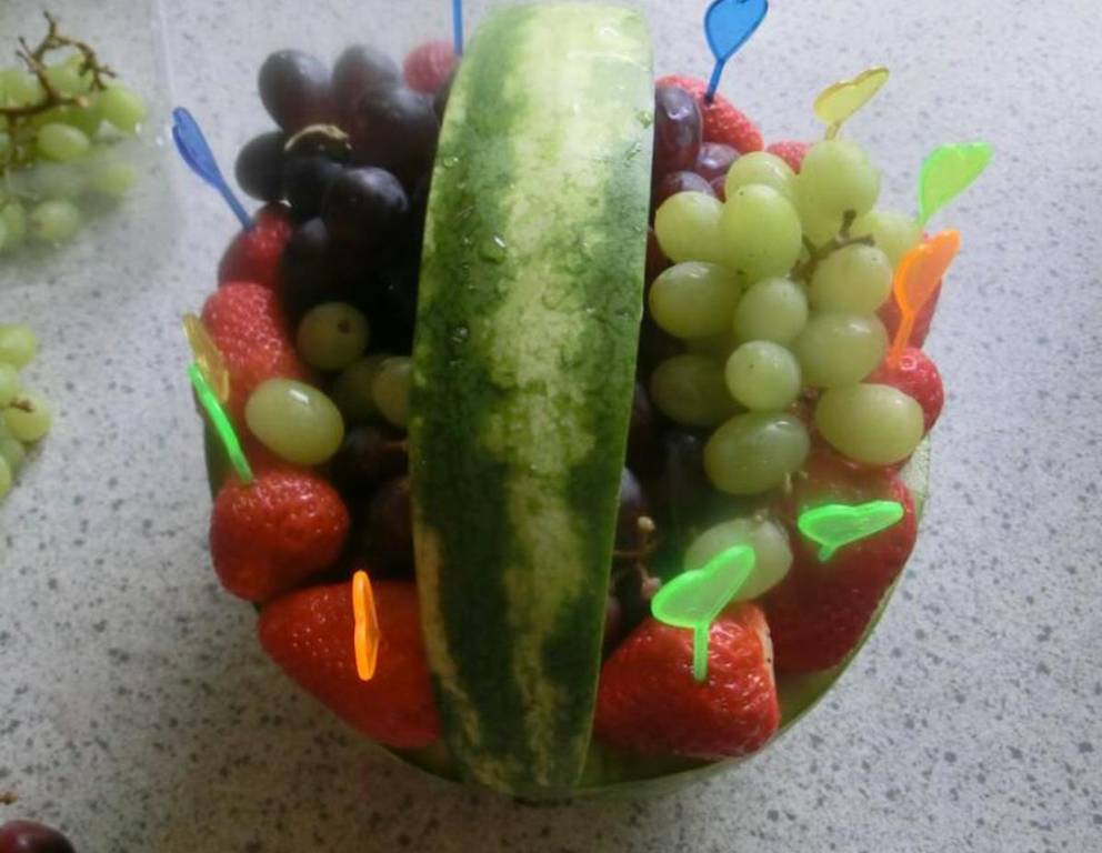 Solch ein Melonenkorb ist tolles und gesundes Geburtstagsgeschenk. Kann mit anderen Früchten erweitert werden. Aus dem übrigen Fruchtfleisch können auch Figuren und Motive geschnitzt werden und ebenfalls am Körbchen trapiert. Der Phantasie sind hier keine Grenzen gesetzt!