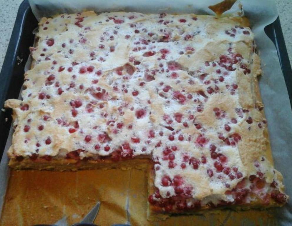 - Währenddessen die restlichen Eiklar mit dem Rohrzucker und dem Vanillezucker steif aufschlagen, die Ribisel untermischen und auf den vorgebackenen Boden streichen.