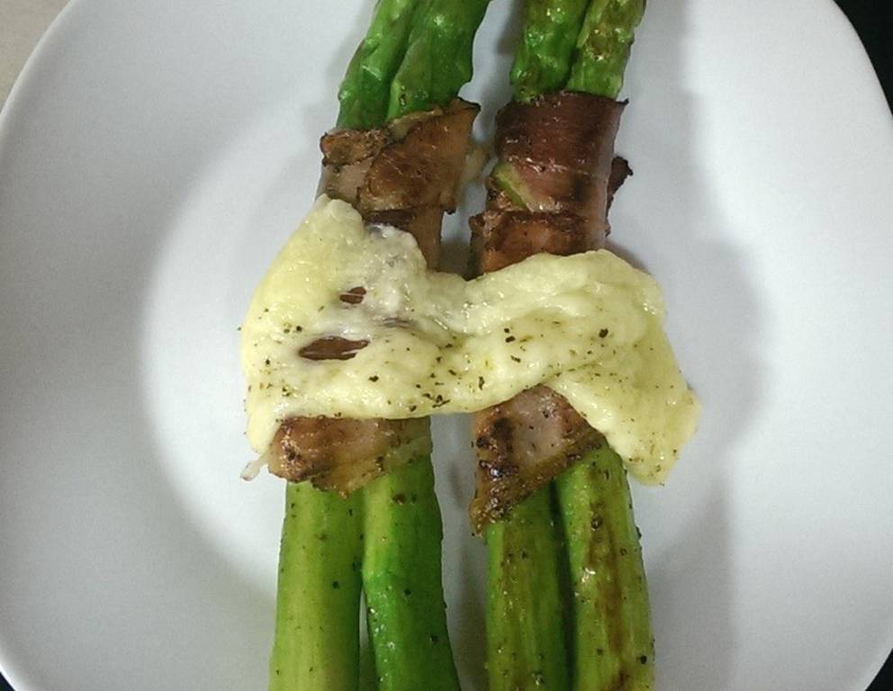 - Den Spargel mit Salz und Pfeffer würzen, mit Speck umwickeln und in einer Pfanne mit etwas Butter anbraten. Den Käse auf ein Teller geben, etwas pfeffern und in der Mikrowelle kurz schmelzen.