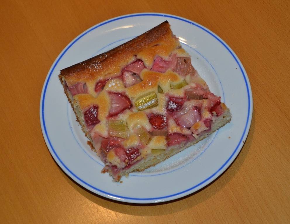 - Danach die Rhababer- und Erdbeerstücke gleichmäßig auf dem Teig verteilen, leicht andrücken und ab ins Rohr! Am Besten noch lauwarm genießen!