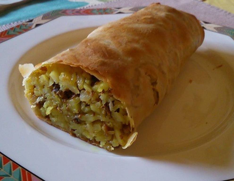 - Die Zwiebeln in Öl anschwitzen und die geraspelten Erdäpfel dazu geben und einige Zeit rösten bis die Erdäpfel fast durchgegart sind. Die Masse salzen, pfeffern, mit Cumin und Curcuma abschmecken.