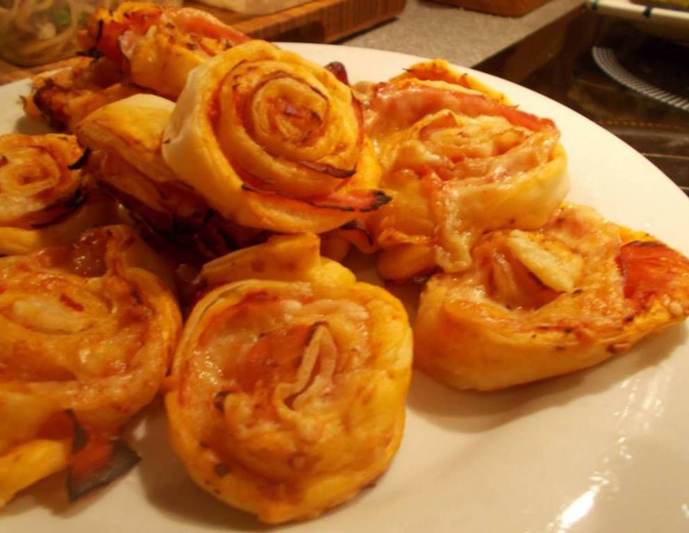 - Den Blätterteig vorsichtig zusammen rollen und entweder vor oder nach dem Backen in kleine Röllchen schneiden. Die Pizza-Schnecken je nach Ofen und Größe der Form bei 150° ca. 15-20 Minuten backen.