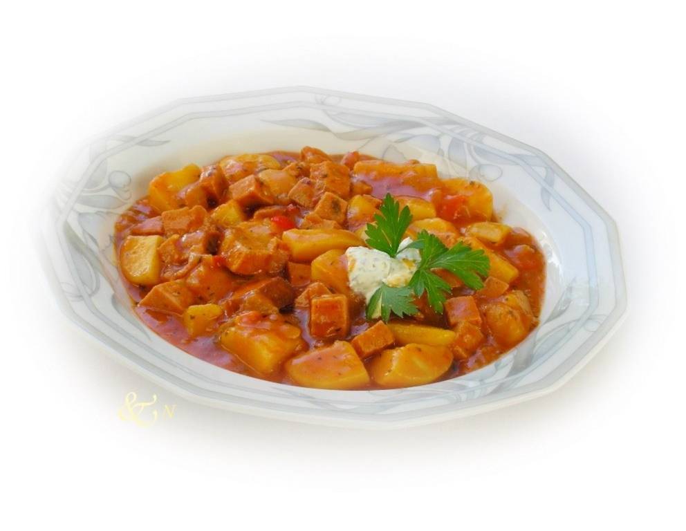 Man kann das Kartoffelgulasch anstatt mit Leberkäse auch mit Geflügelwürstchen (Frankfurter, Debreziner) zubereiten.