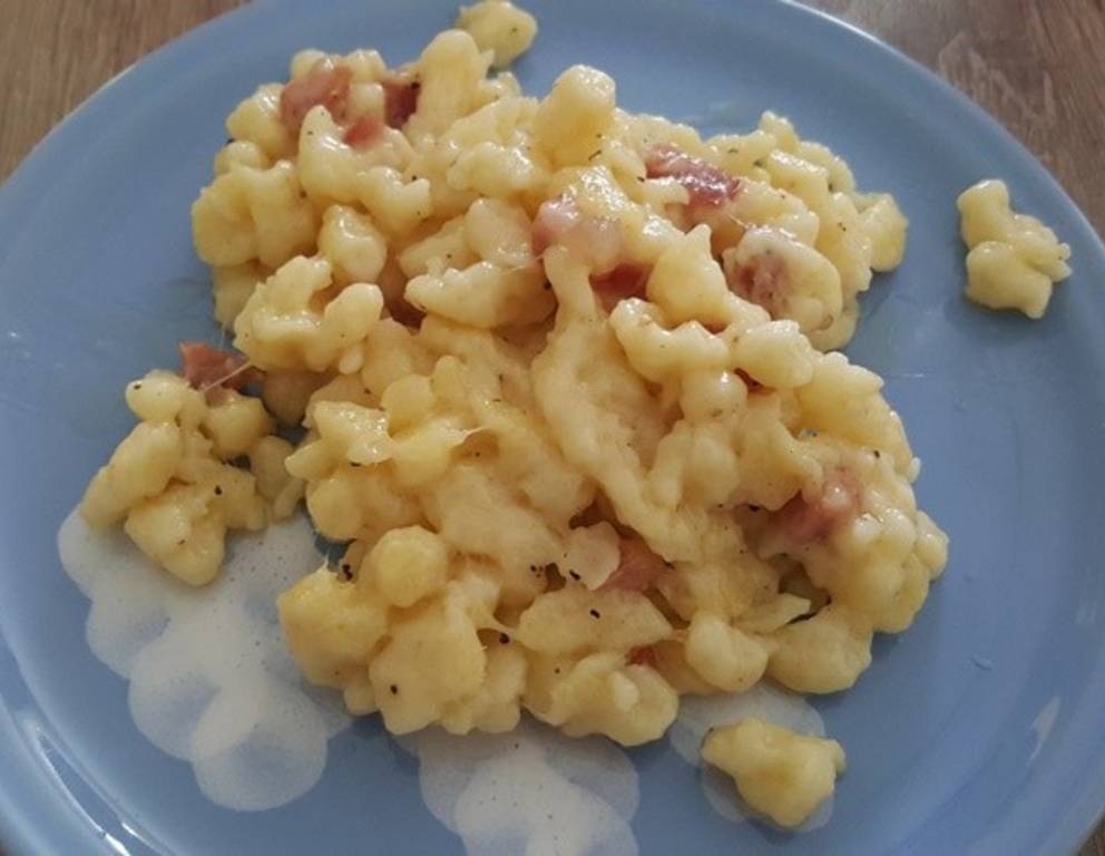 - Danach die Spätzle abseihen. Den Speck in Würfel schneiden und in einer Pfanne mit Olivenöl etwas anbraten. Die Spätzle hinzufügen und mit geriebenen Käse bestreuen.