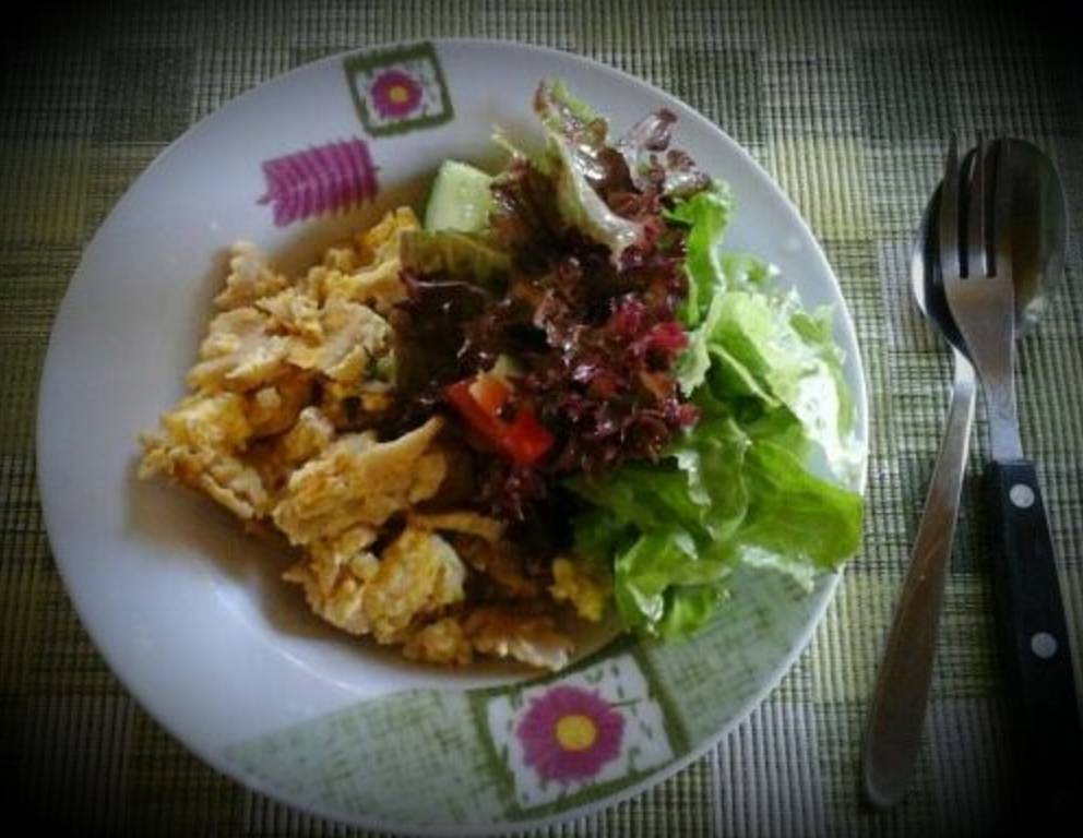 - Alles in eine große Schüssel geben. Marinieren und kurz vor dem Servieren mit etwas Öl übergießen und schön durchmengen. Die Eiernudeln mit geschnittenem Schnittlauch bestreuen und servieren.