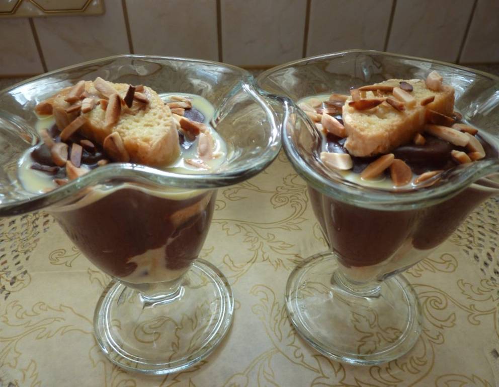 - Schokoladepudding nach Packungsanweisung kochen, 2 EL geröstete Mandelstifte in den Pudding rühren und auf die 4 Gläser aufteilen.