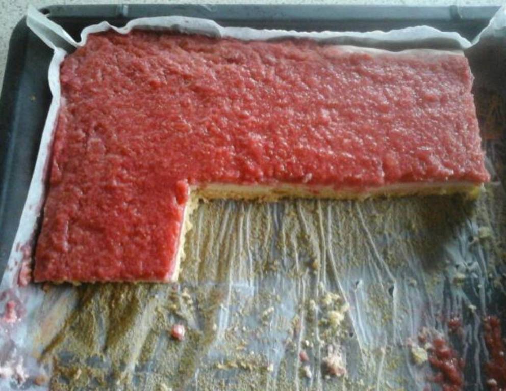 - Für die Erdbeer-Topfen-Schnitte aus den Teigzutaten ein verkehrtes Dinkelbiskuit herstellen und im Rohr bei 180 Grad Heißluft ca. 10-12 Minuten backen. Währenddessen die Creme vorbereiten.