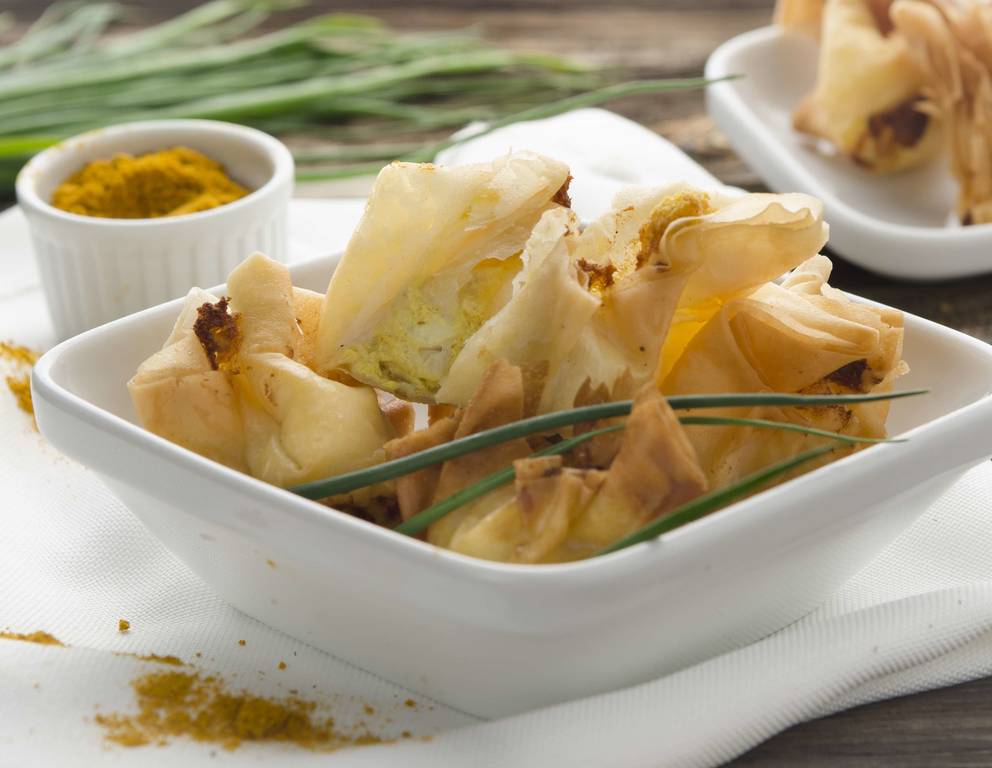 - Die Strudelsäckchen mit Zander, Curry und Ricotta auf einer Platte anrichten und noch warm servieren.