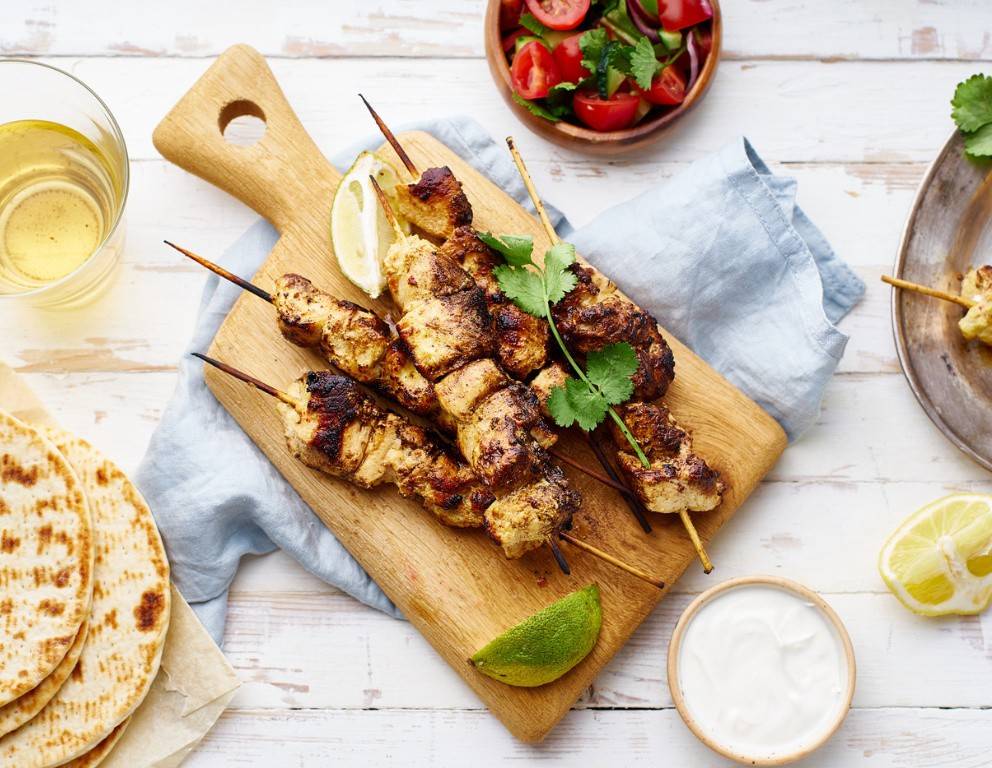 Zu den Hühner-Souvlaki passt Knoblauchbrot, Tzatziki und Gemüse.