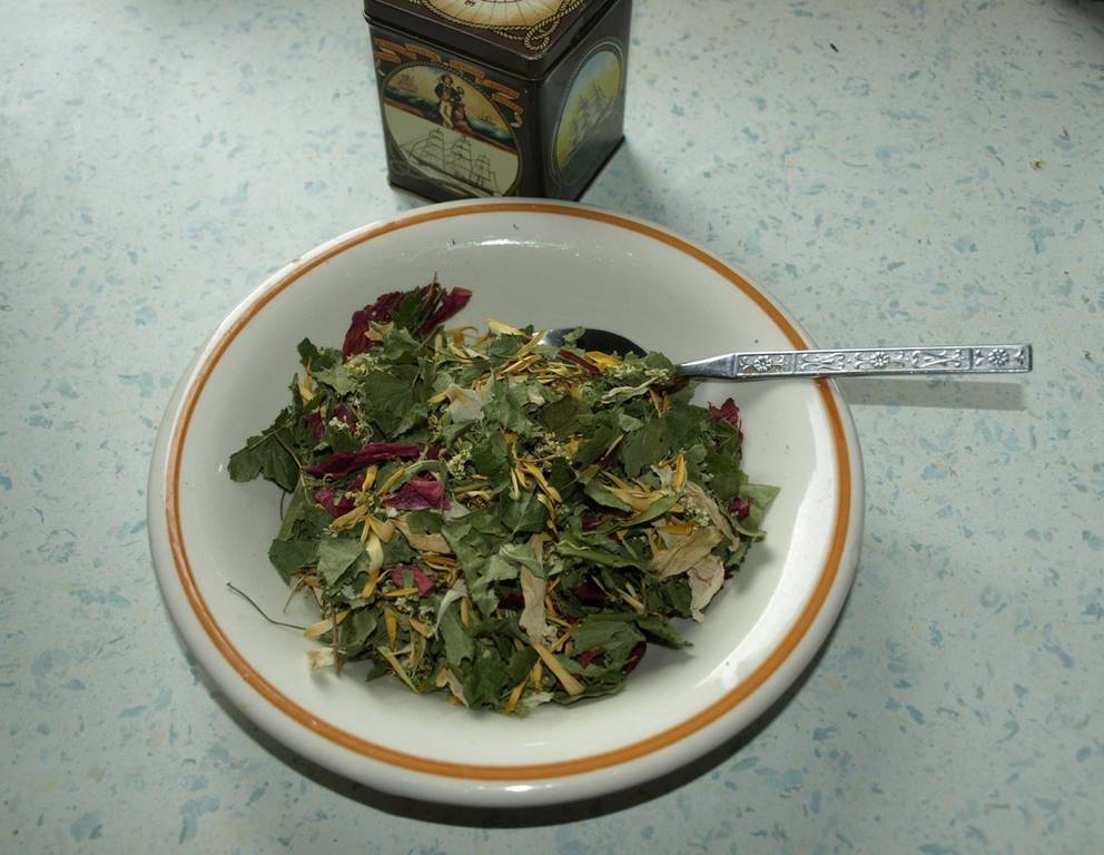 - Für den blumigen Kräutertee die getrockneten Blätter grob zerrieben in eine Supenschüssel geben und mit den Blüten vermischen. In ein Glas oder eine Teedose füllen.