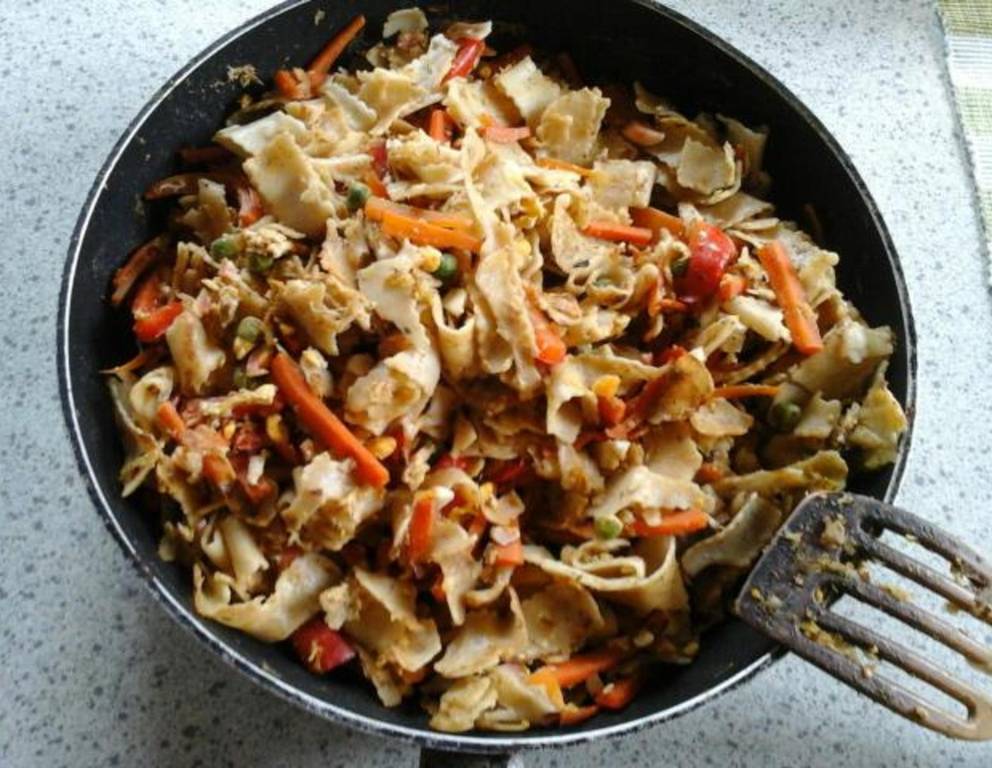- Die hartgekochten Eier fein hacken und ebenfalls untermischen. Ebenso die TK Erbsen und den Mais. Sobald alles ein bisschen Farbe angenommen hat, die gekochten Dinkelnudeln dazugeben und mitrösten.