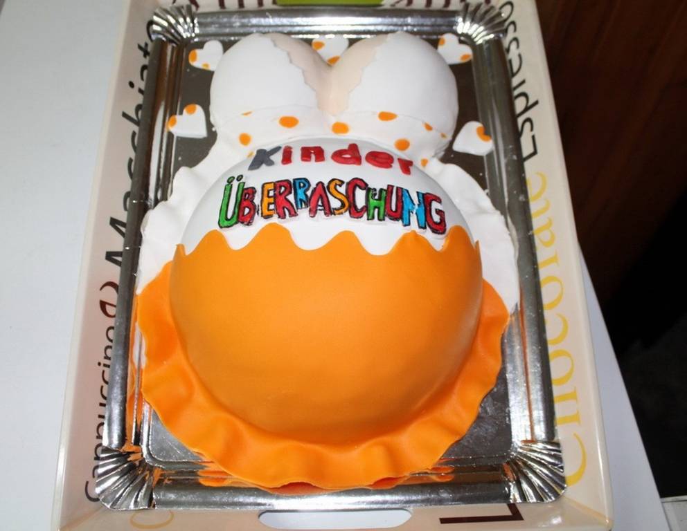 Diese Babybauchtorte hat bestimmt noch niemand bekommen. Die Farben kann man natürlich beliebig variieren und auch ohne "Kinder Überraschung" machen.