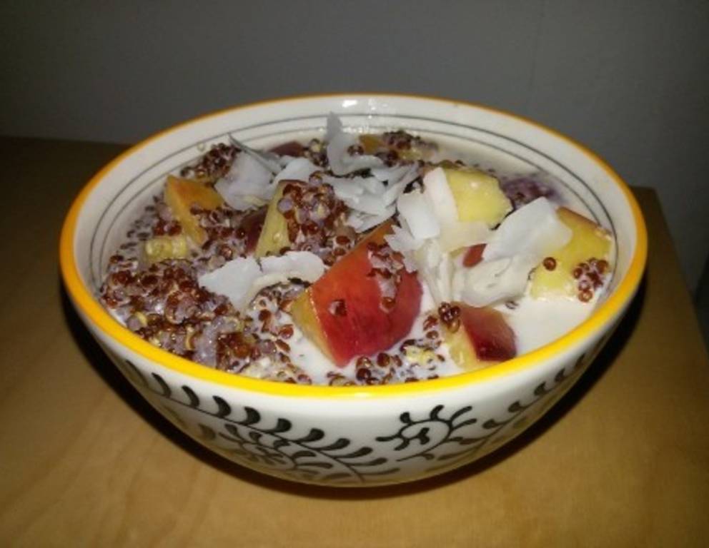 - Nektarine entkernen und klein schneiden. In einer Pfanne Kokosöl erhitzen und Nekatrine kurz erhitzen. Quinoa dazugeben und mit 200 ml Milch aufgießen, ca 2 Minuten köcheln lassen.