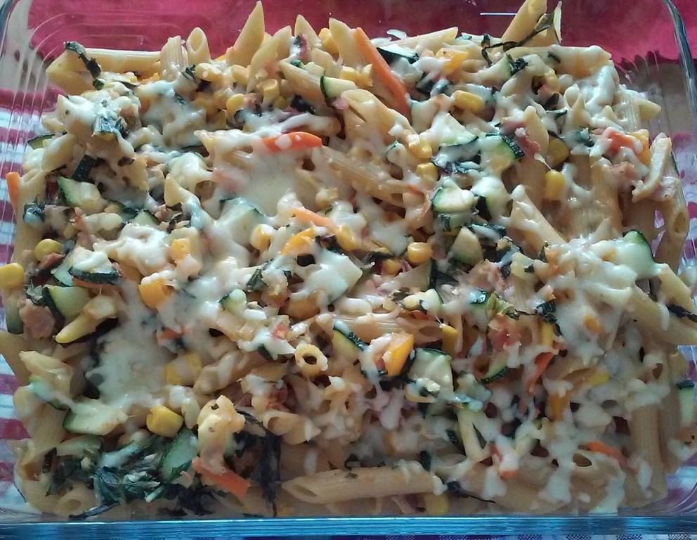 - In eine Auflaufform füllen und mit dem Käse bestreuen. Bei 180 °C ca. 10-15 Minuten überbacken lassen.