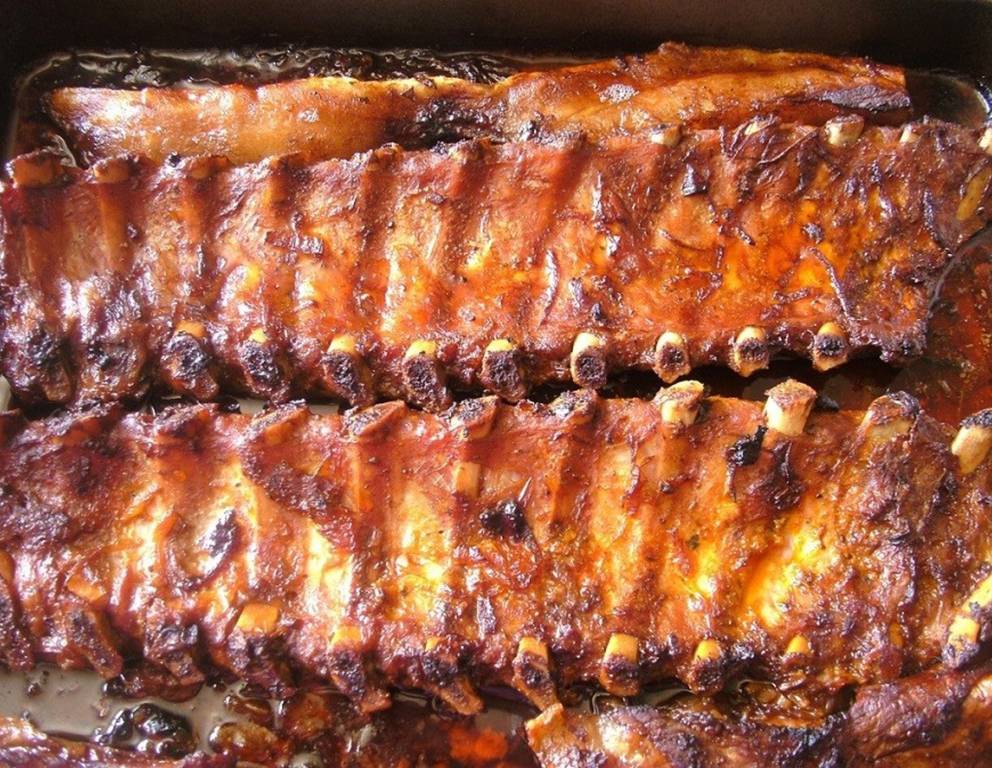 - Die marinierten Spareribs in eine Bratpfanne legen, Zwiebel daraufgeben. Etwas Wasser in die Bratpfanne gießen und für ungefähr 1,5 Stunden braten.