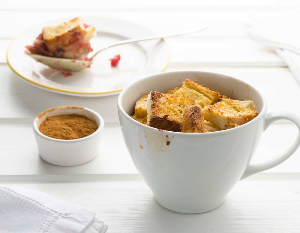 Arme Ritter im Häferl können auch in der Mikrowelle zubereitet werden. Die Backzeit und Menge der Zutaten variiert je nach Größe der Häferl. Hier wurden 2 große Häferl verwendet.