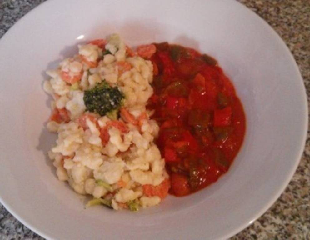 Für eine feurige Version das Letscho mit frischer Chili würzen und die leichten Gemüsespätzle mit Letscho und Sauerrahm servieren.