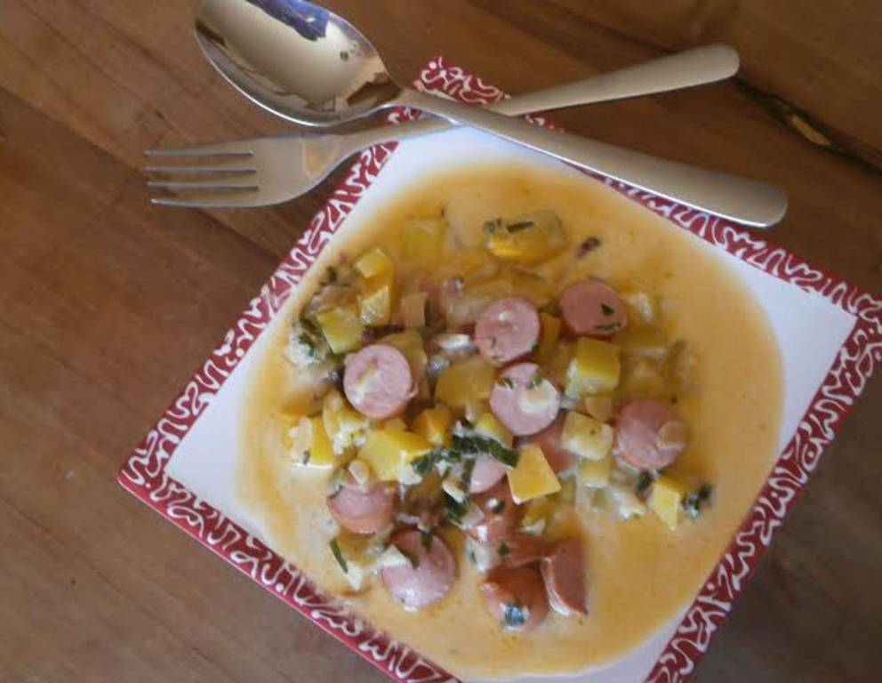 - Geschnittene Würstel dazu geben und kurz mitkochen.