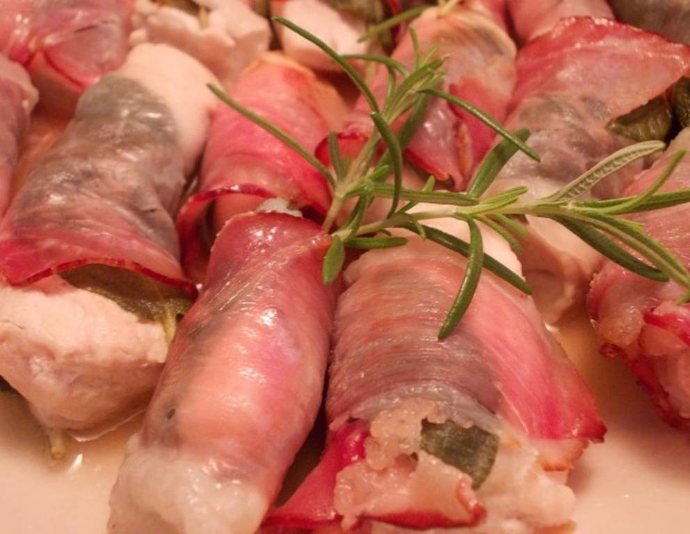 - Für das Hühner-Saltimbocca mit Retsina das Fleisch in kleine Stücke, etwa die Größe der Salbeiblätter, schneiden. Man legt oben und unten ein Salbeiblatt auf die Fleischstücke und umwickelt diese mit einem Stück Rohschinken.