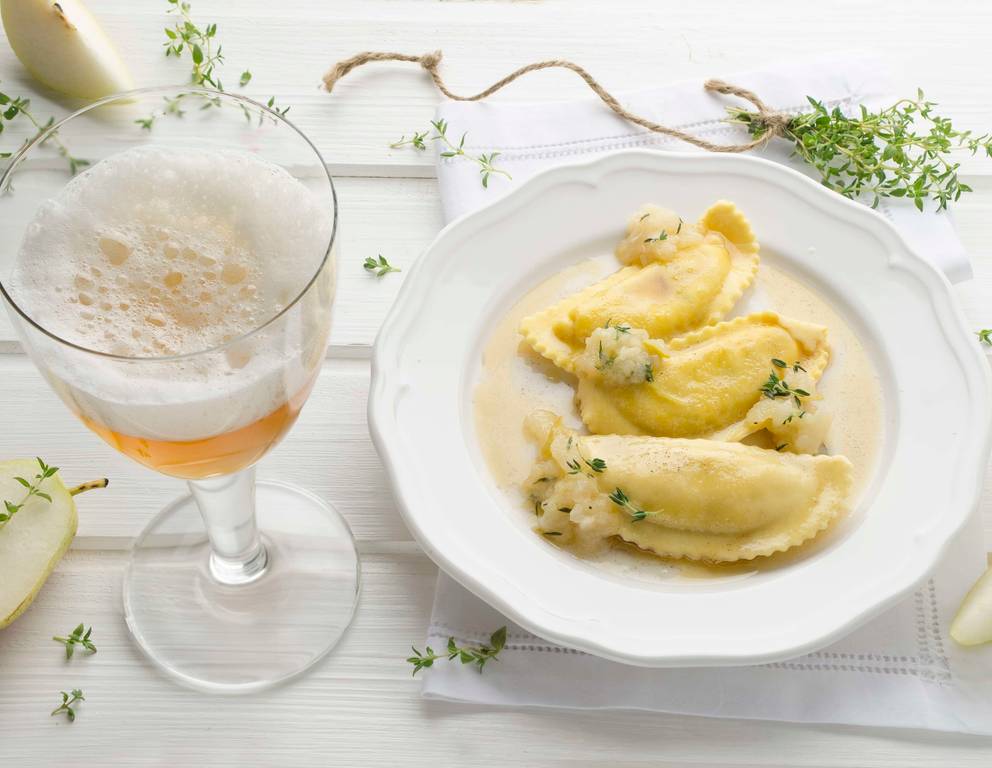"Die Ravioli-Füllung mit Gorgonzola und Birne sowie die Nussbutter verlangen nach einem alkoholreicheren und vollmundigen, spritzigeren Bier, das auch fruchtige Noten - Dank der obergärigen Hefe - beisteuert. Alles Eigenschaften, die in einem Belgisch Blond vereint sind."