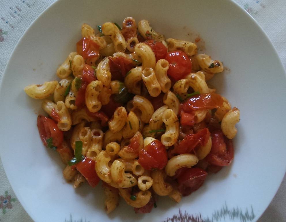- In einer Pfanne etwas Olivenöl erhitzen, Zwiebel und Tomaten darin glasieren, Knoblauch hinzugeben und das Ganze dünsten lassen. Mit etwas Nudelwasser oder normalem Wasser aufgießen (ca. 3 EL). Mit Salz, Pfeffer und Tomatenmark abschmecken.