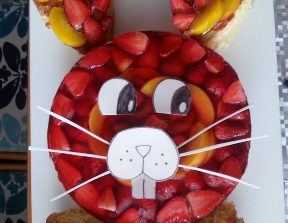 - Aus Esspapier Augen, Schnauze,Zähne und Schnurrhaare zuschneiden und vorm Servieren auf der Fruchtigen Hasentorte platzieren.