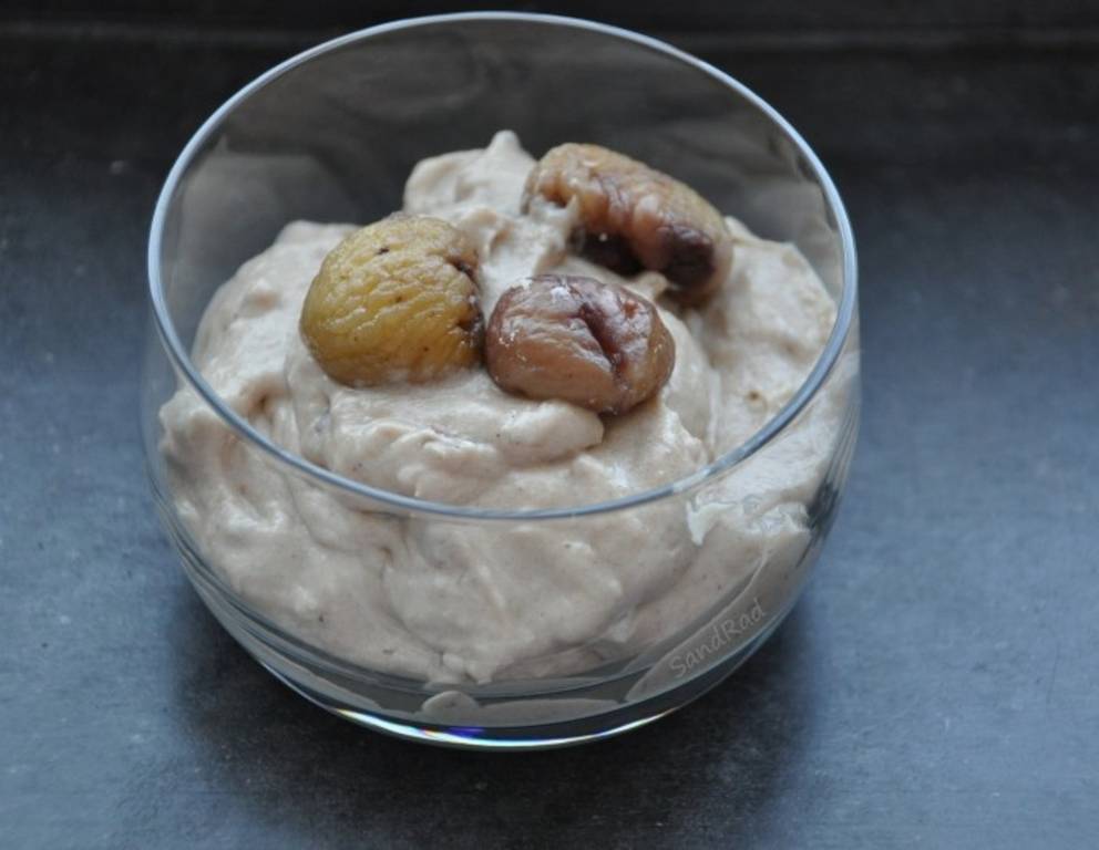 - Das Schlagobers steif schlagen. Dann den Rahm und die Maronicreme vorsichtig unterrühren. Zum Schluss die zerdrückten Maroni unterheben.