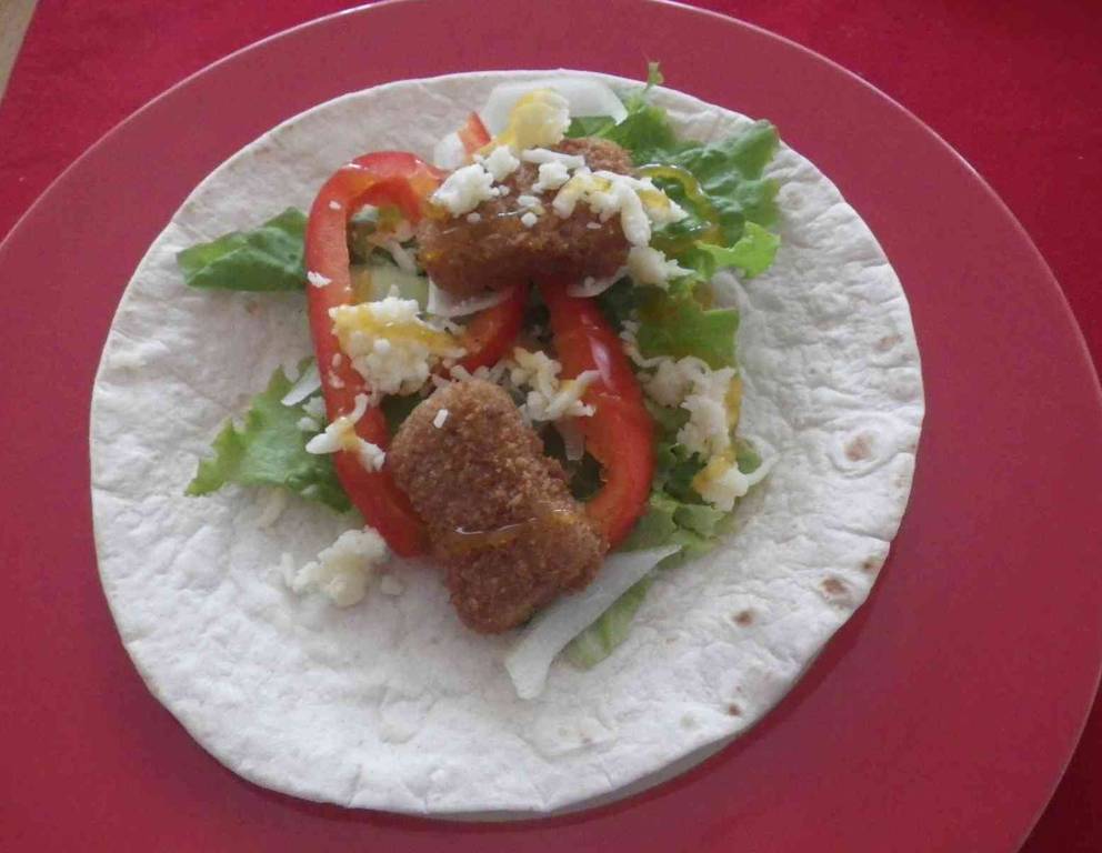 - Für die Wraps die Zwiebel in dünne Ringe und den Paprika in Streifen schneiden. Die Chicken-Nuggets laut Anleitung zubereiten und die Tortilla-Wraps kurz in der Mikrowelle erwärmen.