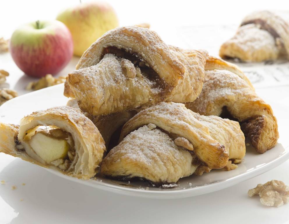 - Auf jedes Dreieck eine Apfelspalte legen und zu einem Kipferl zusammenrollen.