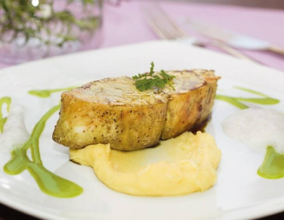 Zum Kürbiskernöl-Butterfisch mit Krenpüree passt im Frühjahr zum Beispiel noch eine würzige Bärlauchsauce.