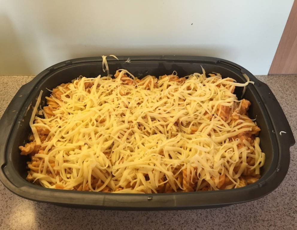 - Währenddessen Nudeln nach Packunsanleitung bissfest garen, mit der Soße vermengen und in eine ausgefettete Auflaufform füllen.