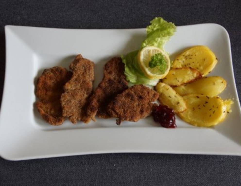 Die Filetschnitzerl mit Walnusspanier mit Blechkartoffeln und Preiselbeeren servieren.