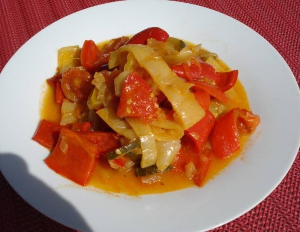 - Mit Knoblauch, Salz und Pfeffer würzen und ca 15 Minuten andünsten lassen. Dann die Zucchini beigeben und weitere 10 Minuten köcheln.