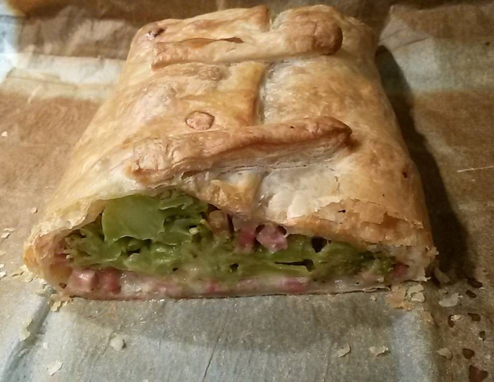 - Schinken mit Käse und Zwiebel vermengen.Dinkelblätterteig ausrollen, Hälfte von der Käse-Schinken-Zwiebelmischung darauf verteilen, Brokkoliröschen darauf verteilen, salzen, pfeffern und die restliche Käsemischung darauf verteilen.