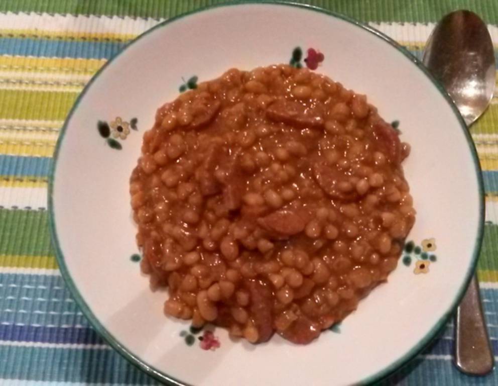 - Bohnen mit dem Saft hinzufügen, Tomatenmark und Gewürze einrühren. 20 Minuten kochen lassen, nochmals abschmecken und eventuell nachwürzen.